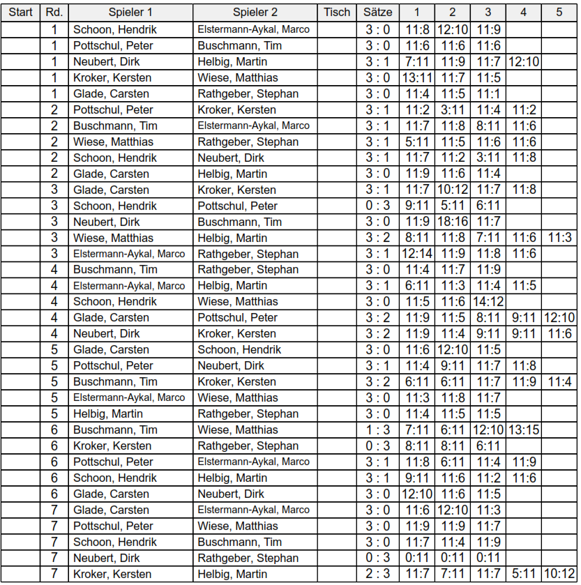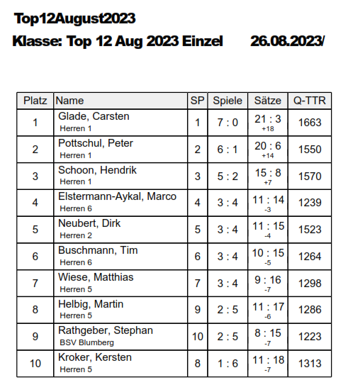 Am Ende setzte sich mit Carsten der bisherige Sieger aller vier Top 12 Turniere erneut durch, auch wenn es im direkten Duell mit Peter P. nur zu einem hauchdünnen Fünfsatzsieg reichte.